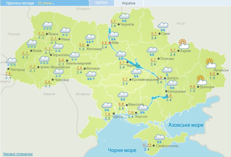 Завтра, 25 січня, у Донецькій, Луганській та Харківській областях буде сонячна погода: вдень повітря прогріється до +7, а вночі температура впаде до +3. У всіх західних областях буде мокрий сніг з температурою до +1, у центральних - очікуються дощі до +5..+9 градусів.