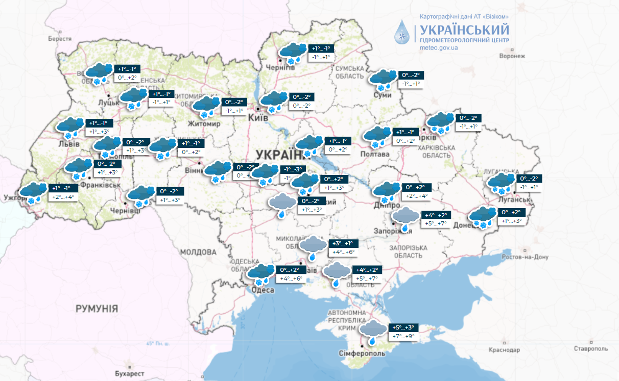 У вівторок, 12 грудня, в Україні очікується мокрий сніг та дощ. Температура вдень від 3° морозу до 4° тепла.