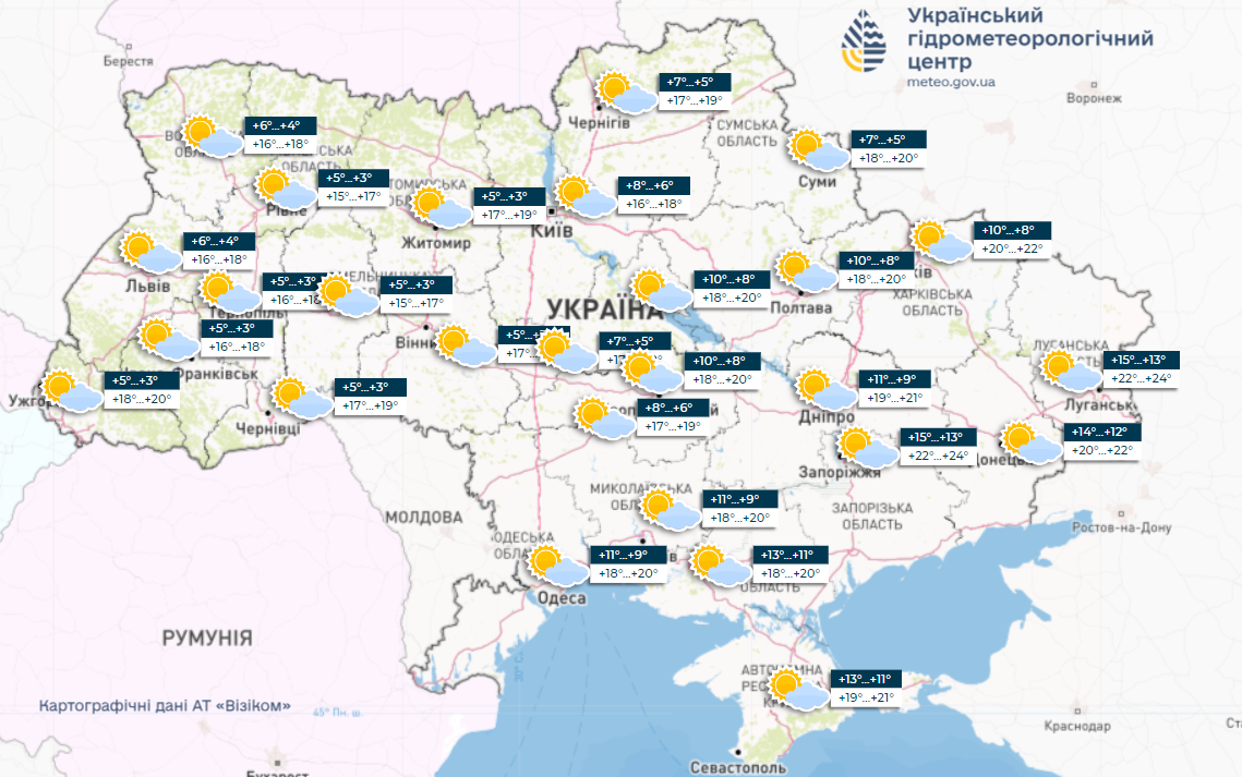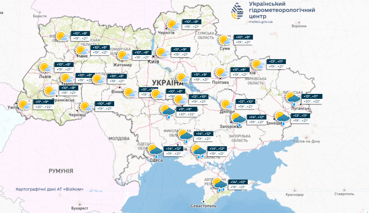 • на півдні – 20-23° вдень та 10-14° вночі. Крім Одеси, яка вдень матиме 16-18°. Вночі в Криму – до 14-16° тепла;