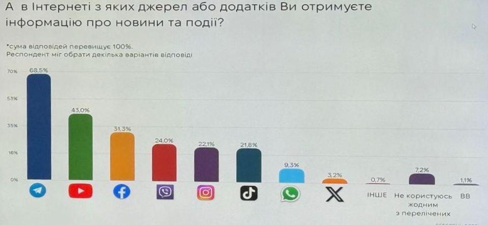 З-поміж популярних джерел в інтернеті, то на другому місці після Telegram йде YouTube (43,0%), на третьому – Facebook (31,3%). А також Viber – (24,0%), Instagram (22,1%), TikTok – (21,8%), WhatsApp – (9,3%), X – (3,2%).