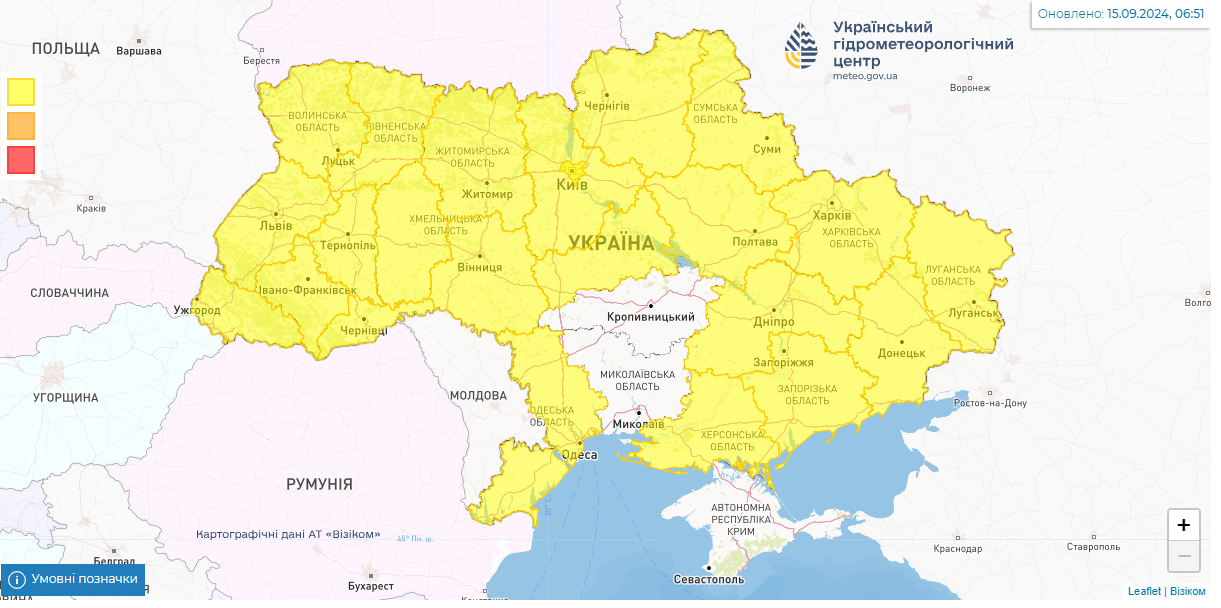 "15 вересня у західних, Вінницькій, Одеській та Житомирській областях грози; у Вінницькій, Хмельницькій, Тернопільській, Львівській, вдень і у Одеській областях значні дощі; на Лівобережжі пориви вітру 15-20 м/с (I рівень небезпечності, жовтий)", - йдеться в повідомленні.