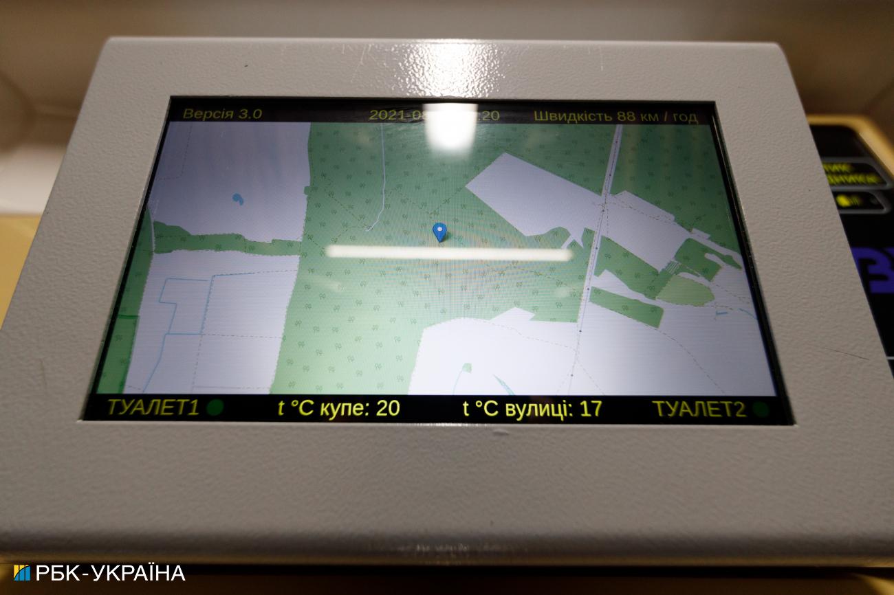 Над вікнами вмонтовані дисплеї, які показують гео-дані поїзда, дату, час, швидкість руху, індикацію роботи туалетів. В санвузлах плацкартних вагонів встановили класичний комплект обладнання, а в якості доповнення - столик для сповивання.