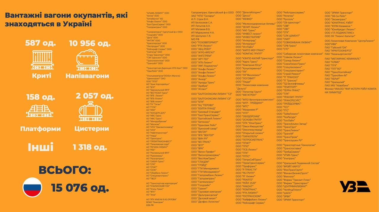Він також перерахував названі компанії, які точно належать Росії. Це ВЕБ-Лізинг, ВТБ-Лізинг, Газпромтранс, ГТЛК, Ощадбанк Лізинг. Усього – понад 3000 вагонів.
