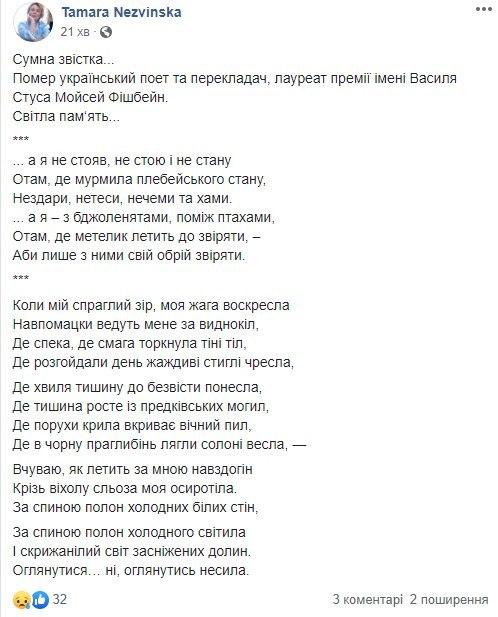 На смерть поета зі скорботою відреагували користувачі соцмереж, публікуючи спогади про зустрічі з Мойсеєм Фішбейном, а також його чудові вірші.