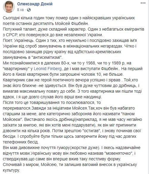 "Поет. Українець. Один з тих, хто неухильно і послідовно захищав ім'я України від спроб звинувачень в міжнаціональних проблемах. Чітко і послідовно захищав рідну країну від кгбістсько-кремлівських звинувачень в "антисемітизмі ", - написав, зокрема, в своєму поминальному пості на Facebok політик і громадський діяч Олесь Доній.