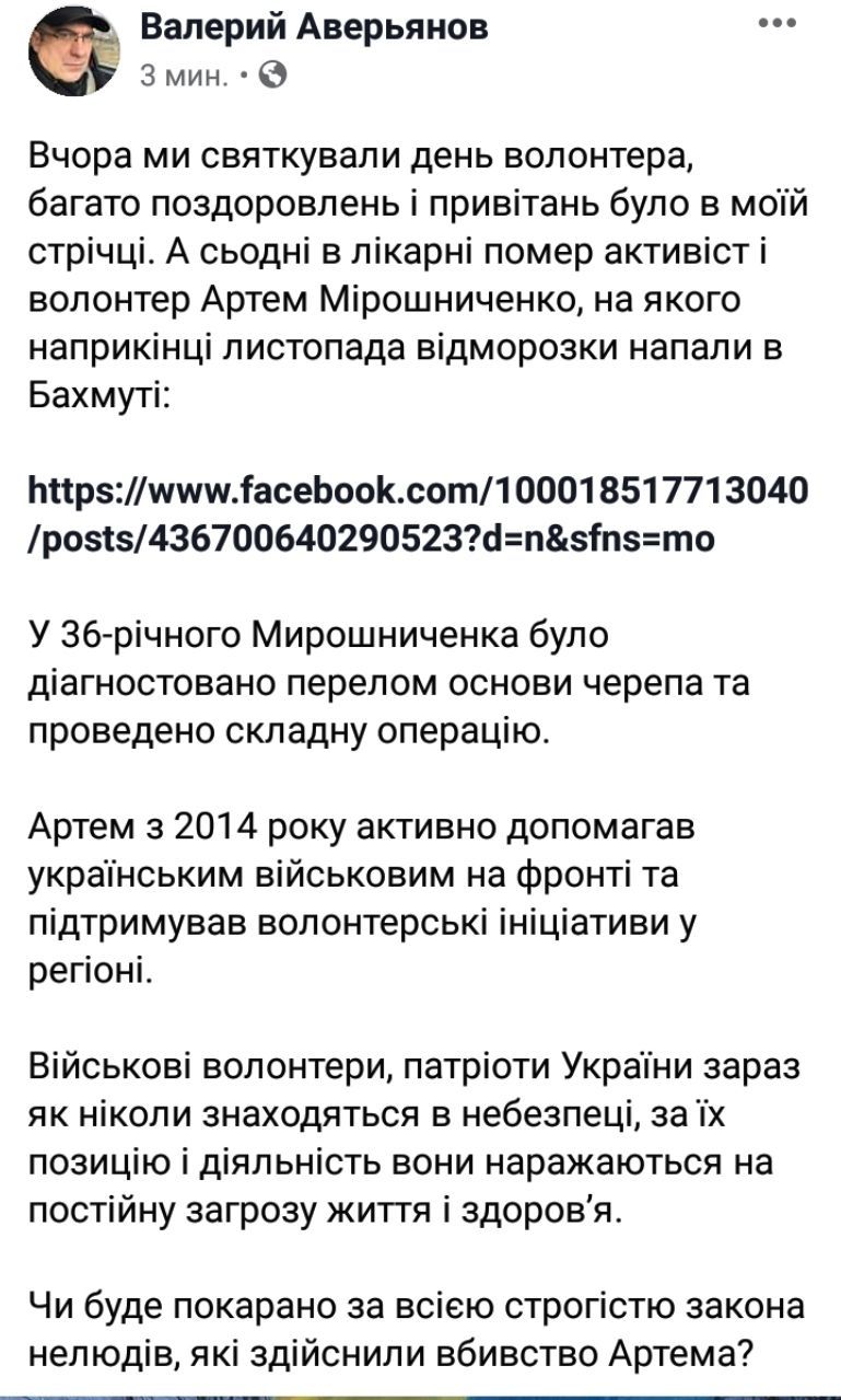 Про це повідомив Валерій Авер'янов на сторінці у Facebook.