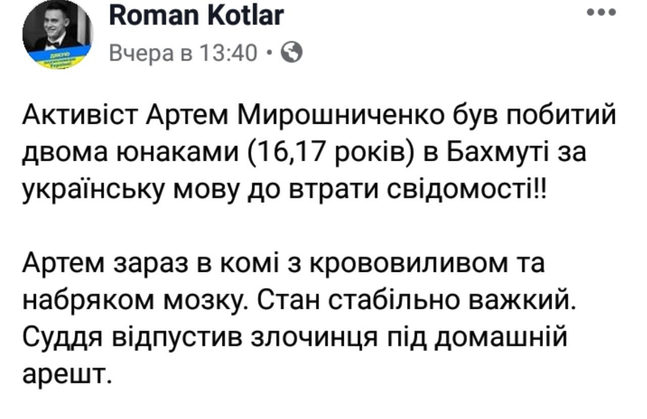 На сторінці у Facebook Роман Котляр повідомив, що волонтера увечері на вулиці Горького побили двоє юнаків 16 та 17 років за те, що чоловік говорив до них українською мовою. Били зі словами: "Ты можешь говорить нормально? Мы по-украински не понимаем". 16-річному нападнику 2 грудня Артемівський міжрайонний суд обрав запобіжну міру у вигляді домашнього арешту. У залі суду підозрюваний, який виявився місцевим спортсменом, під тиском своєї матері просив вибачення. Виправдовувався тим, що не хотів бити Мірошніченка до втрати свідомості.