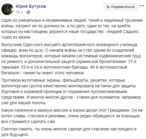 "Один з унікальних і незамінних людей, тихий і надійний трудівник війни, патріот не за посадою, а у справі, один з тих, на хребті яких по-справжньому тримається наша держава - Андрій Садило... Пішов з життя", - написав він.