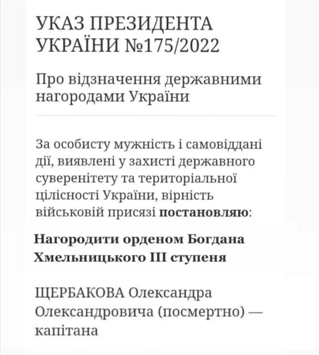 За особисту мужність і самовіддані дії, виявлені у захисті державного суверенітету та територіальної цілісності України під час збройної агресії Російської Федерації, вірність військовій присязі Указом Президента України № 175/2022 від 26.03.2022 року Олександр Щербаков нагороджений орденом Богдана Хмельницького 3 ступеня посмертно.