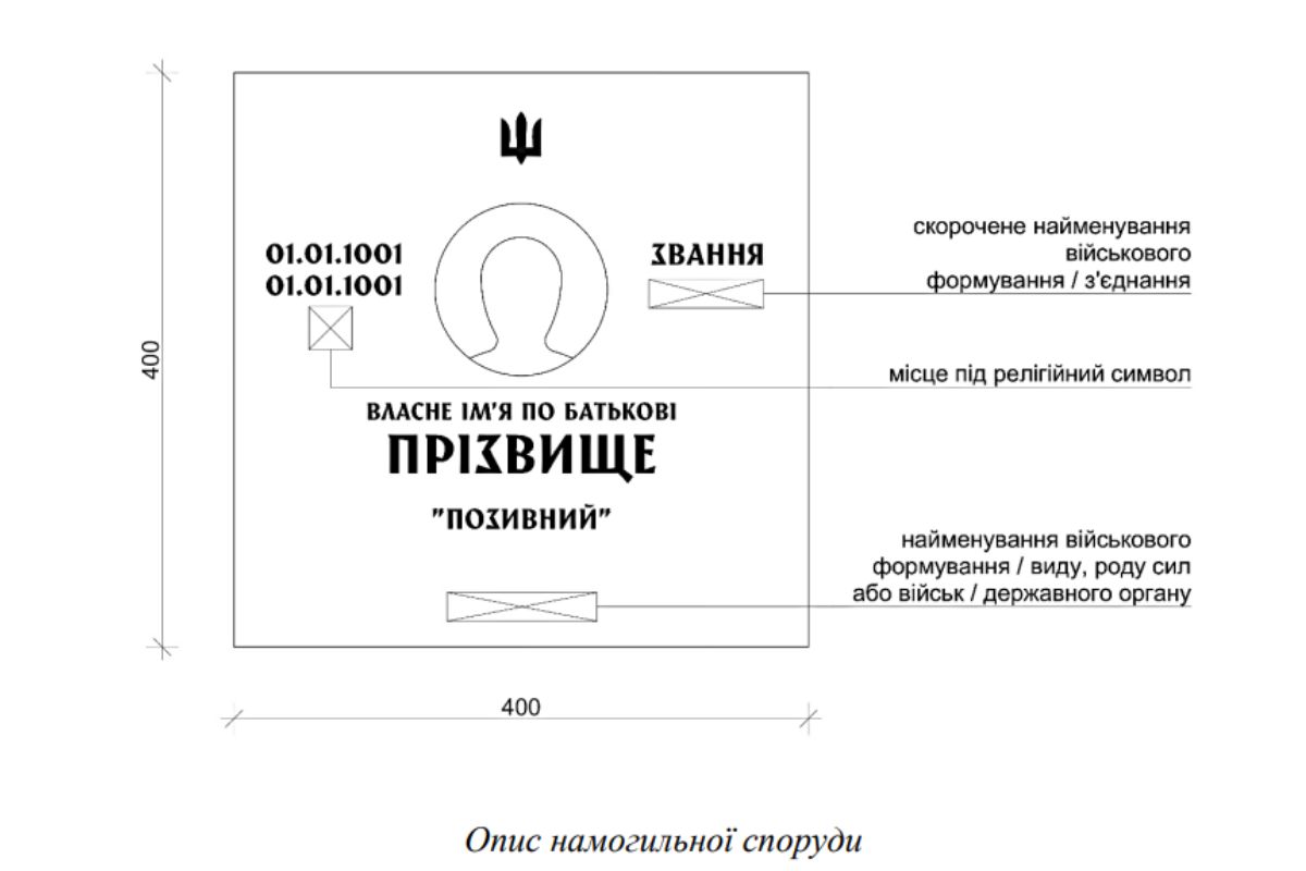 Важливо, що тепер за бажанням виконавця волевиявлення загиблої людини або того, хто зобов"язався її поховати, можна додати низку додаткових елементів. На лицьовій поверхні пам"ятної плити може бути нанесене зображення релігійної символіки, а також позивний загиблого. Крім того, дозволено вказувати скорочене або повне найменування військового формування/з"єднання чи найменування виду, роду сил або військ (чи державного органу), до якого належала людина.