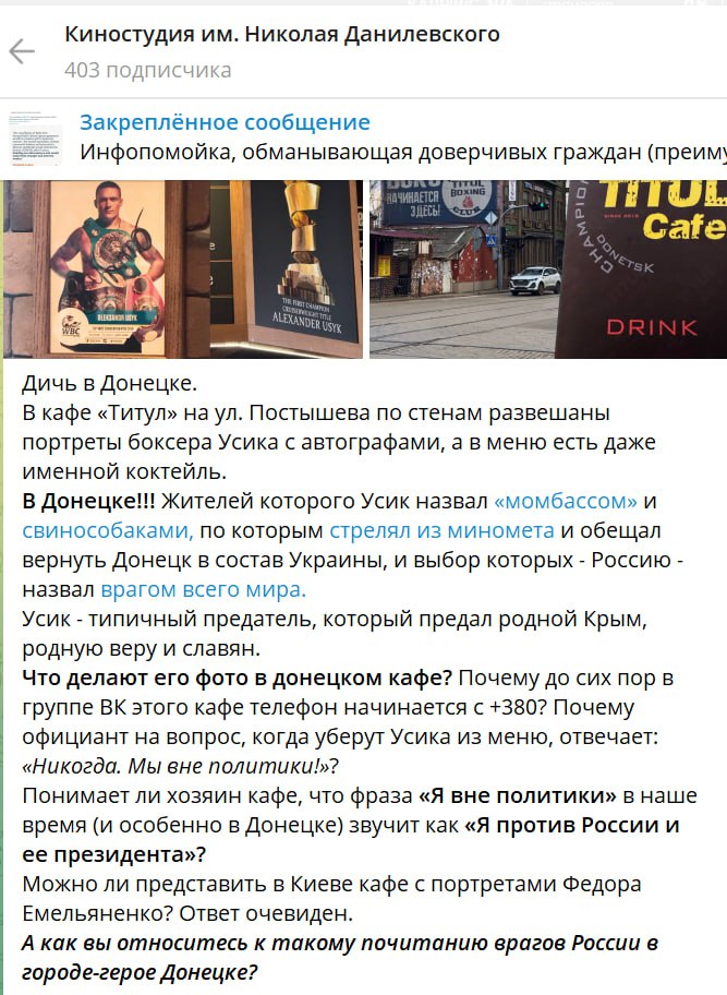 "Усик стріляв, публічно принижував, виявляв ненависть до жителів Донбасу. А в цьому кафе - коктейлі на його честь. І адже до власника спочатку прийшли звичайні люди, а він їх послав. Скільки ще в нас у Росії таких ждунів із п'ятої колони?!". Донецьк приємно дивує: на 4-му році повномасштабної війни в одному із закладів міста шанують і вихваляють всесвітньо відомих українських спортсменів. Що поробиш - російських вигнанців не пускають на престижні змагання, тож вболівати на рингу доводиться за Олександра Усика, чиї портрети і навіть іменний коктейль прикрашають донецький ресторан", - пише журналіст.