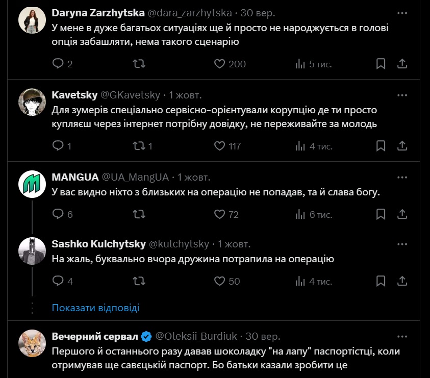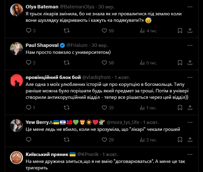 В коментарях під його твітом інші користувачі назвали винятки, де ще збереглася корупція, зокрема конкретні заклади освіти та лікарні.