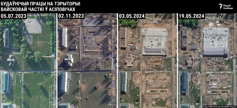 Супутникові знімки процесу будівництва двох нових ангарів та реконструкції будівель на території військової частини в Осиповичах. У чорних прямокутниках дати зображень.