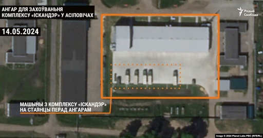Супутниковий знімок першого ангара для зберігання "Іскандерів", збудованого у квітні 2023 року на території військової частини в Осиповичах. 14 травня 2024 р