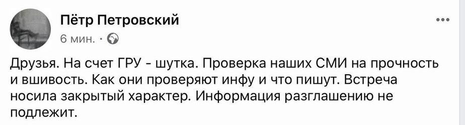 Пізніше Петровський видалив пост і написав новий: "Друзі, щодо ГРУ - жарт. Перевірка наших ЗМІ на міцність. Як вони перевіряють інфу і що пишуть. Зустріч носила закритий характер. Інформація розголошенню не підлягає".
