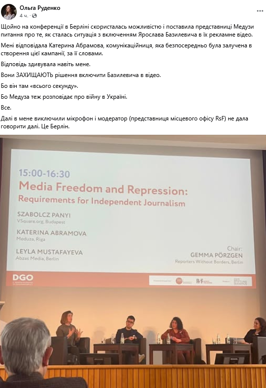 "Щойно на конференції в Берліні скористалась можливістю і поставила представниці Медузи питання про те, як сталась ситуація з включенням Ярослава Базилевича в їх рекламне відео. Мені відповідала Катерина Абрамова, комунікаційниця, яка безпосередньо була залучена в створення цієї кампанії, за її словами. Відповідь здивувала навіть мене. Вони захищають рішення включити Базилевича в відео. Бо він там "всього секунду". Бо Медуза теж розповідає про війну в Україні. Все. Далі в мене виключили мікрофон і модератор (представниця місцевого офісу RsF) не дала говорити далі...", - йдеться у дописі Руденко.