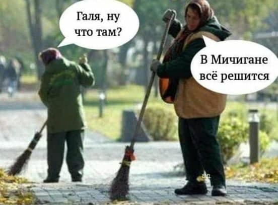 Крім того, автори забавних картинок висміяли надто уважне ставлення українців до виборів за океаном. Зокрема, не обійшлося без традиційної двірнички Галі, яка у відповідь на просте запитання "Що там?" глибокодумно відповідає: "У Мічигані все вирішиться".