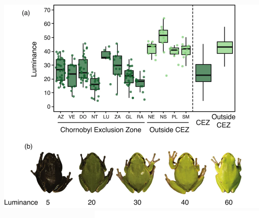 Виявилося, що жаби з темнішим відтінком шкіри мають вищий рівень меланіну, який може ефективно нейтралізувати вільні радикали, що зменшує пошкодження ДНК від радіації. Дослідження також показало, що жаби, які мешкали найближче до місця вибуху (де зафіксовано найвищі рівні радіації), мали найтемніший колір шкіри. Вчені вважають, що це свідчить про еволюцію жаб, які внаслідок катастрофи на Чорнобильській АЕС протягом кількох поколінь отримали темніший відтінок шкіри.