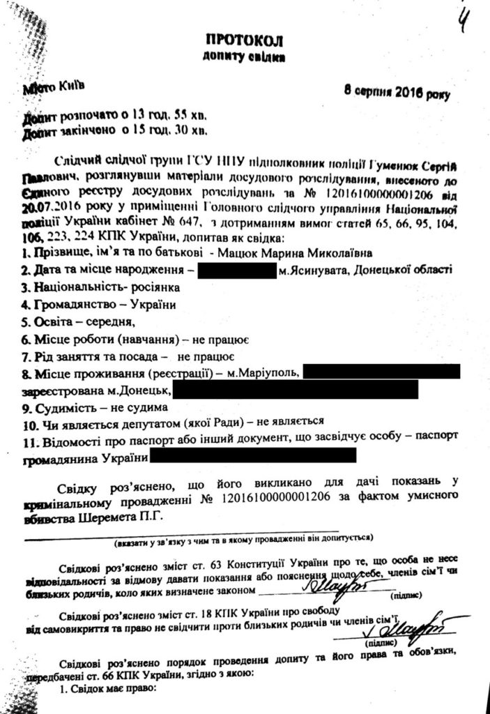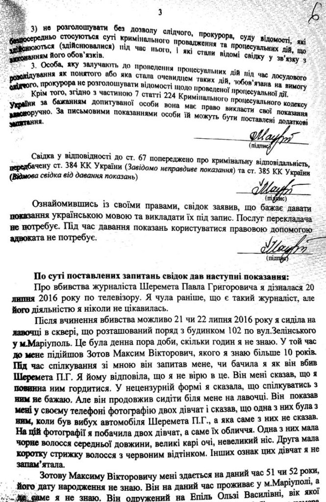 Свідчення Мацюк задокументовані і під пунктом про кримінальну відповідальність за надання завідомо неправдивих показань є її підпис.