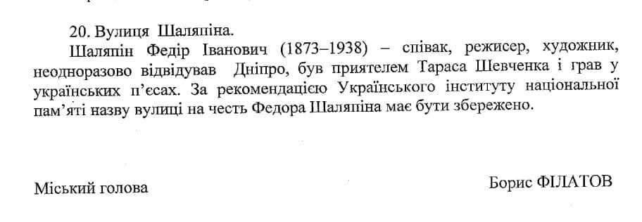 У Дніпрі депутати проголосували за повернення назв 20 топонімам, які були перейменовані у липні 2024 року. Серед них - вулиця Федора Шаляпіна, російського співака, який відвідував місто і, як заявлено "був приятелем Тараса Шевченка".