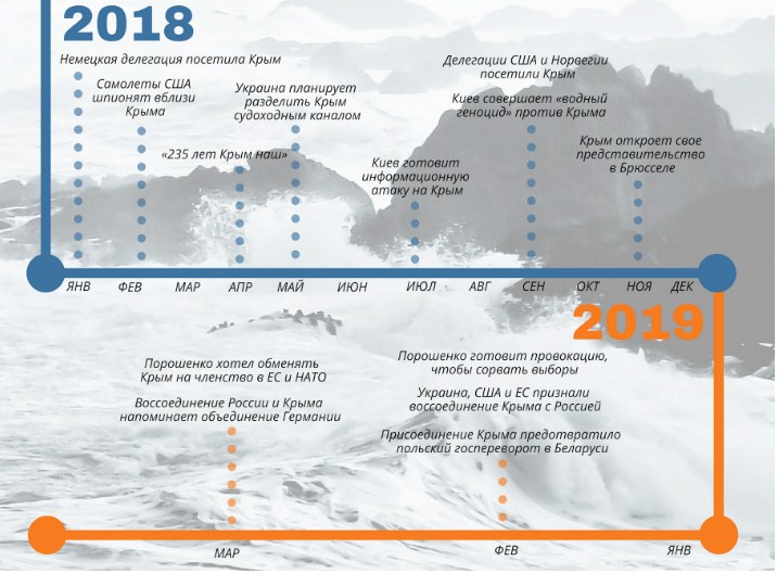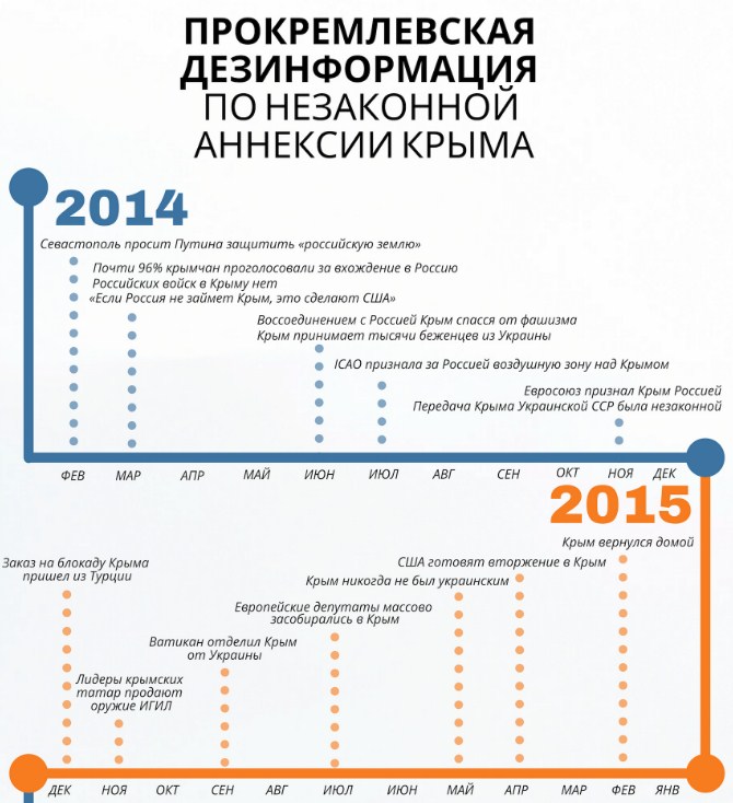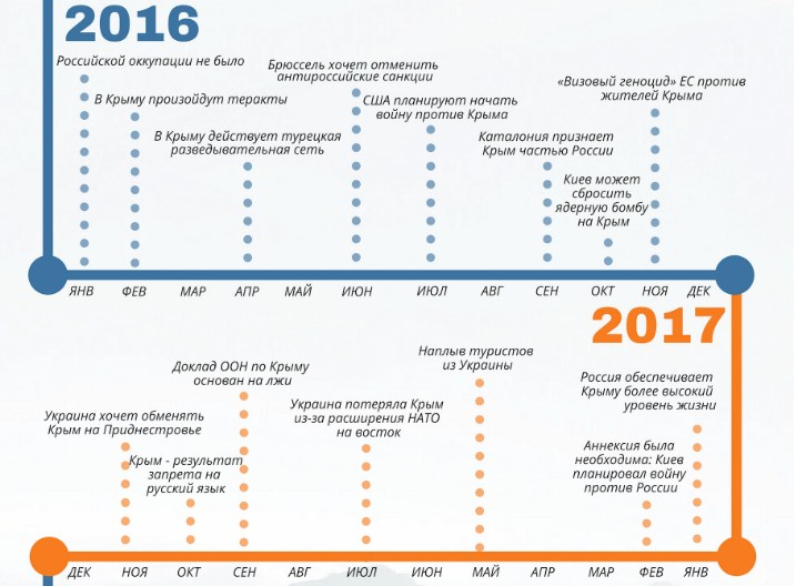У мережі опублікували інфографіку, яка ілюструє тези російської пропаганди з питання анексії Криму починаючи з 2014 року.