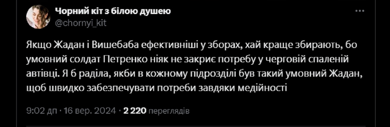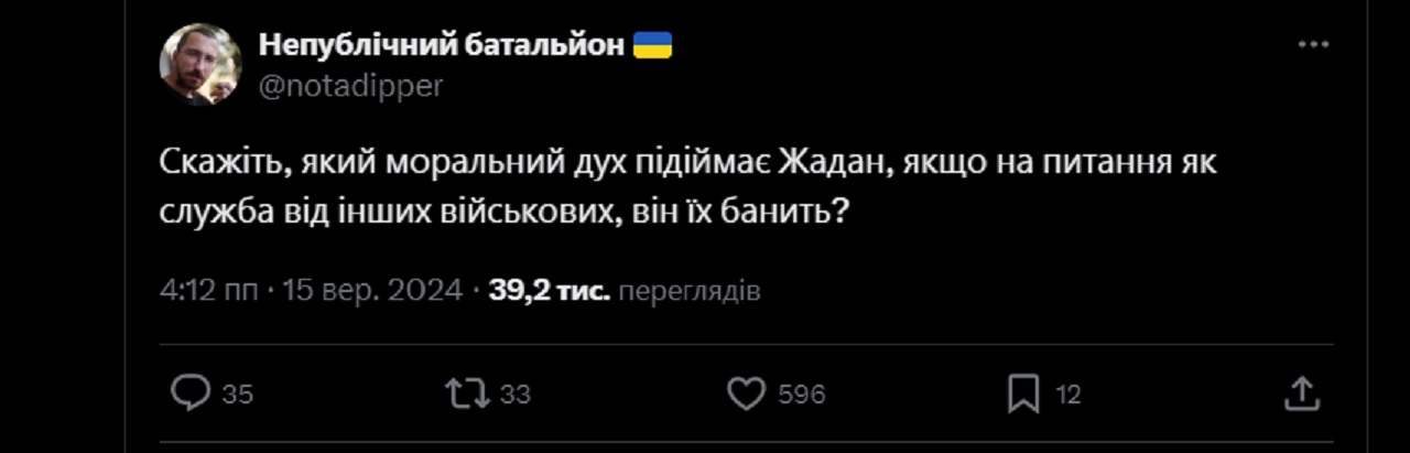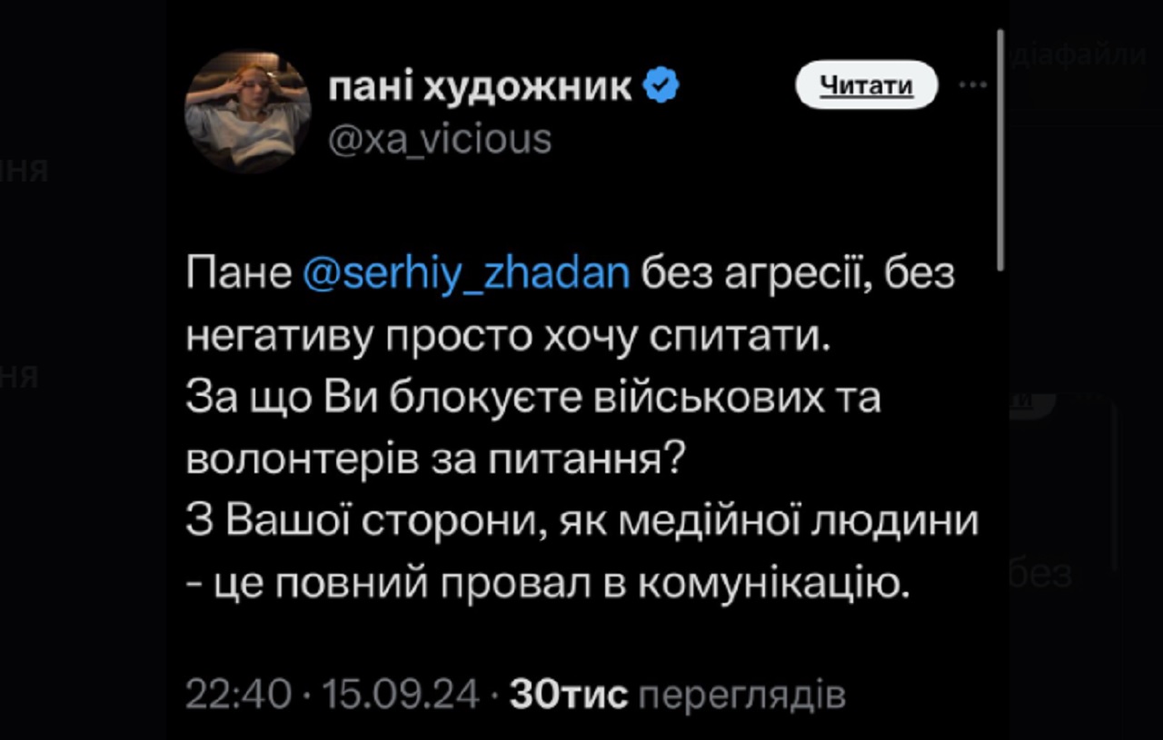 Таких випадків у Х було помічено десятки чи навіть сотні – будь-який коментар під дописами Жадана в контексті його служби в ЗСУ призводив до майже моментального бану.