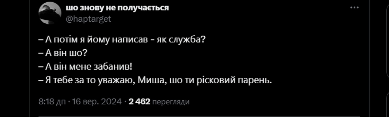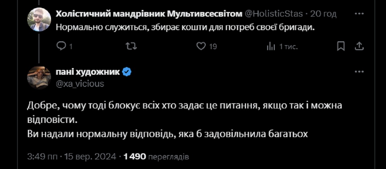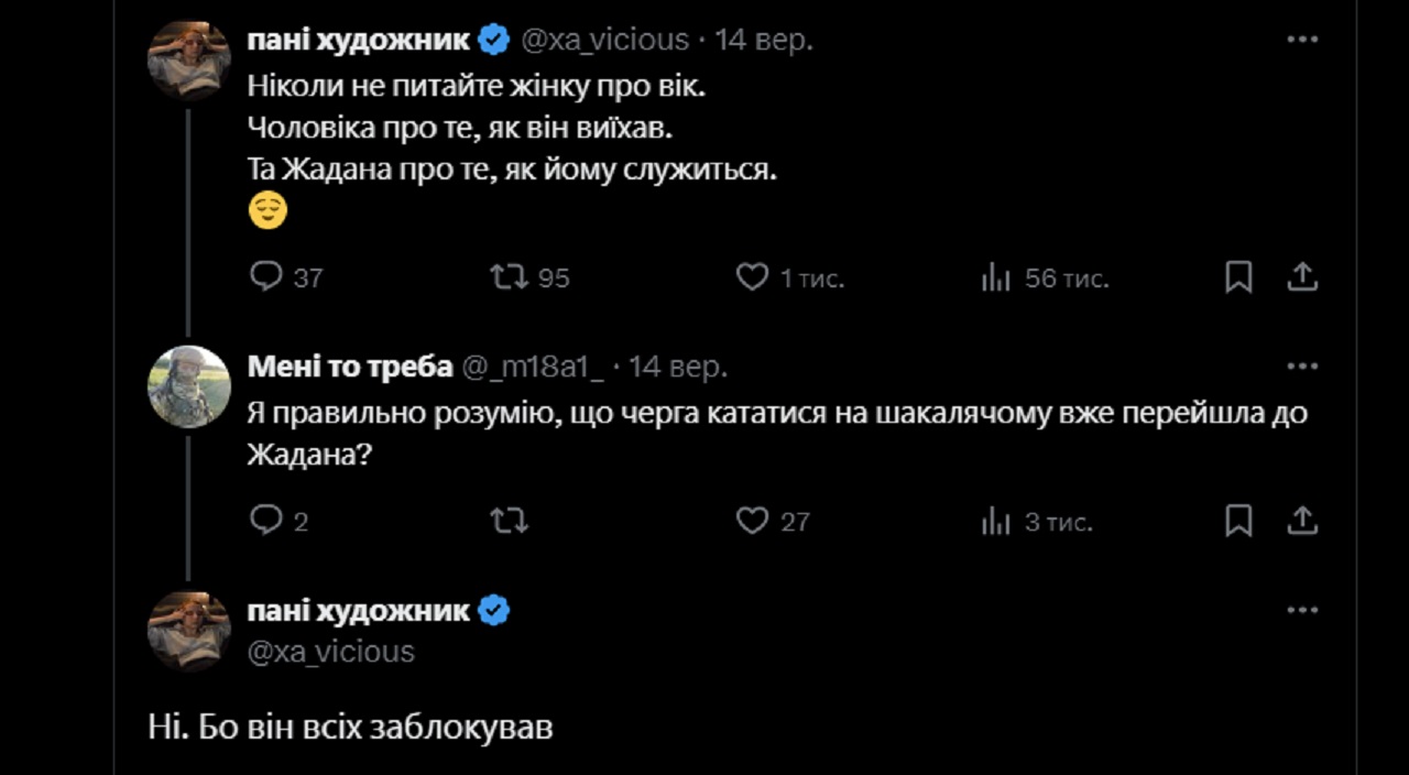На це зокрема вказав користувач Х "Кляте військо 2.0", він опублікував скрін зі словами подяки Жадану за службу в коментарях під його дописом (можливо, з іронічним підтекстом), а потім показав, що письменник його забанив.