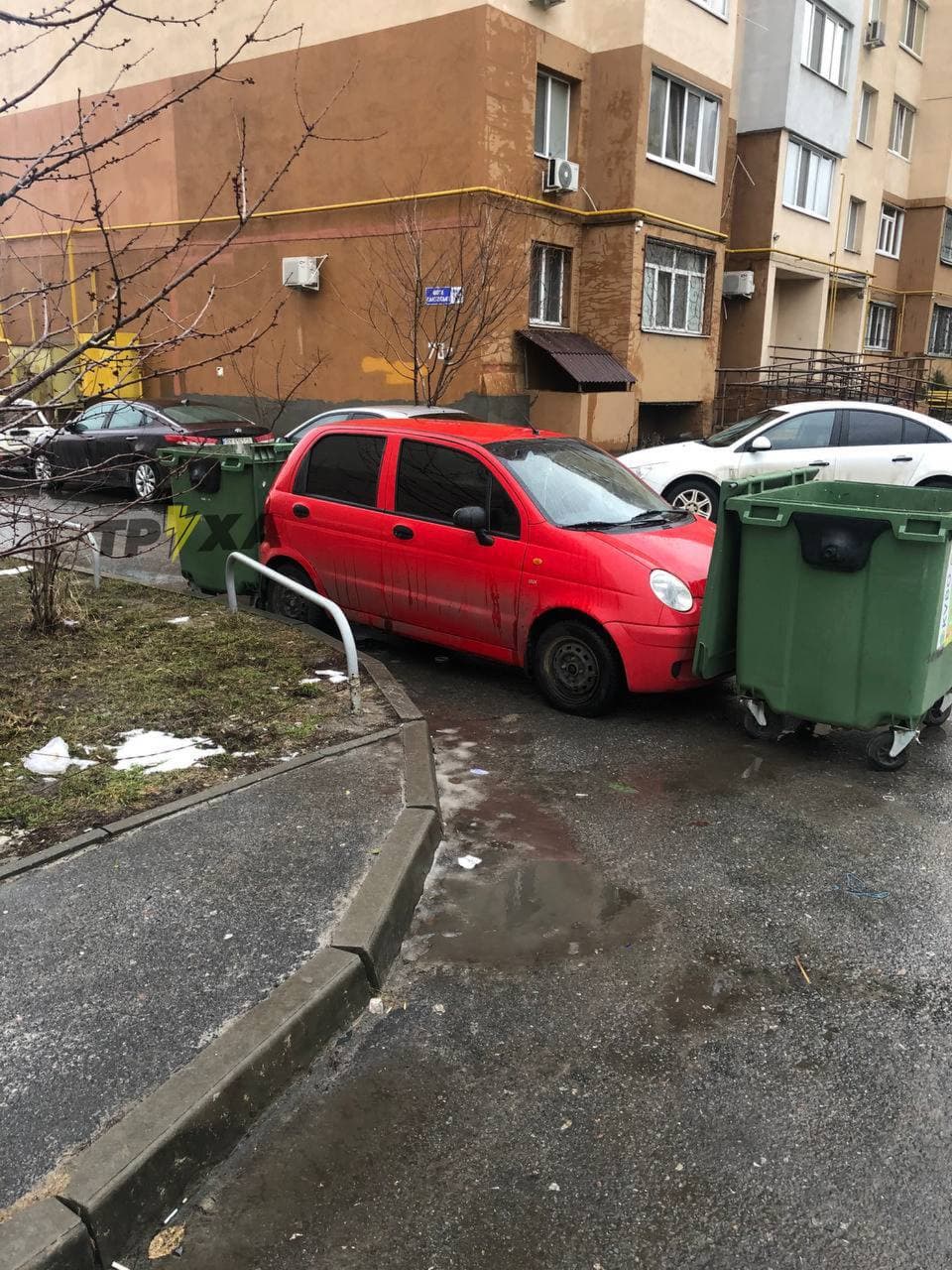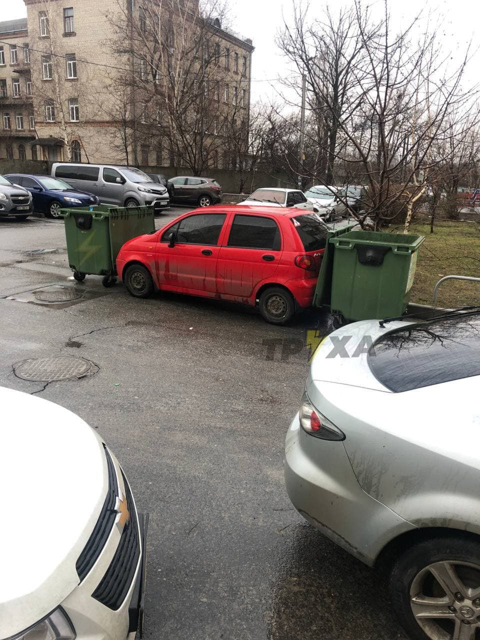 Як видно на фото, співробітники комунальної сфери заблокували автомобіль порушника, поставивши попереду і позаду машини сміттєві баки. Щоб виїхати, водієві доведеться власноруч відтягнути їх.