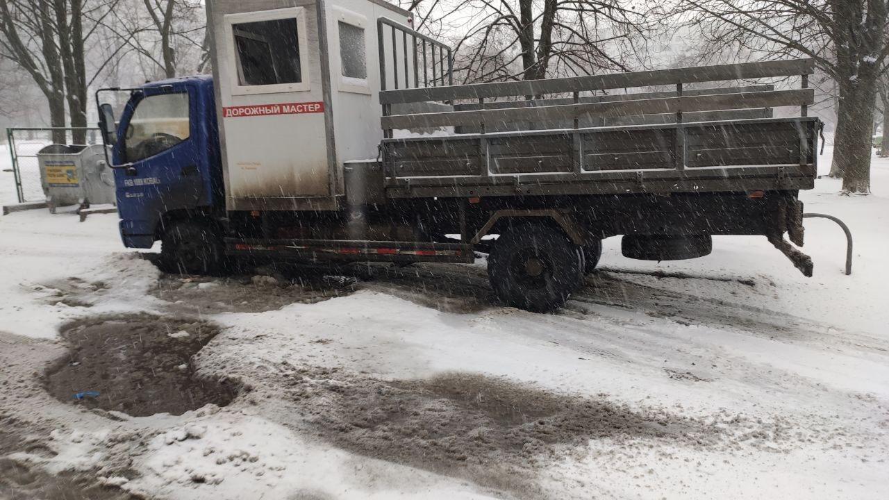 На знімку спецавтомобіль з написом "Дорожній майстер" провалився переднім колесом в гігантську вибоїну на розбитій дорозі біля сміттєвого майданчика.