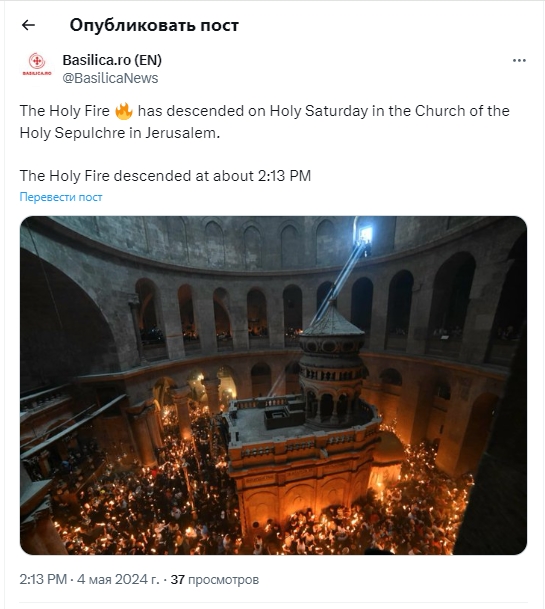 У Велику суботу перед Великоднем, 4 травня, у храмі Гробу Господнього в Єрусалимі зійшов Благодатний вогонь.