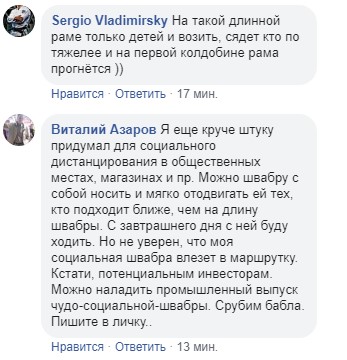 "На такій довгій рамі тільки дітей і возити, сяде хто по важче і на першій вибоїні рама прогнеться", "Я ще крутіше штуку придумав для соціального дистанціювання в громадських місцях, магазинах та ін. Можна швабру з собою носити і м'яко відсувати тих, хто підходить ближче, ніж на довжину швабри. з завтрашнього дня з нею буду ходити. Але не впевнений, що моя соціальна швабра влізе в маршрутку", - пишуть в коментарях.