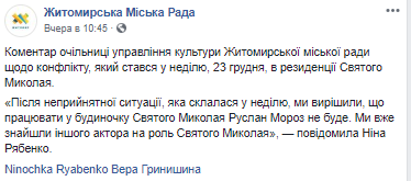 "Після неприйнятної ситуації, яка склалася 23 грудня, ми вирішили, що працювати у будиночку Святого Миколая Руслан Мороз не буде. Ми вже знайшли іншого актора на роль Святого Миколая", – написала жінка.