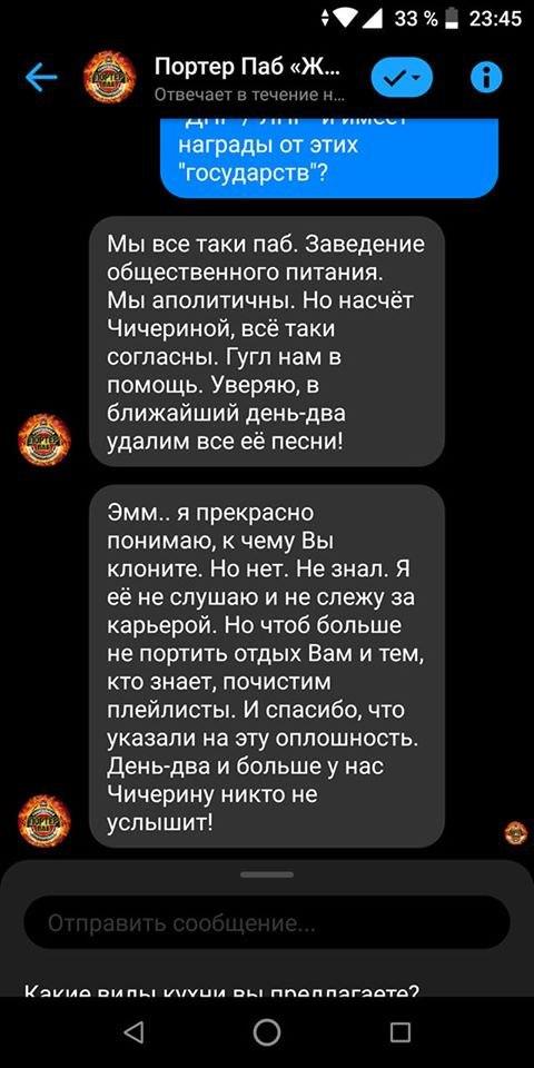 В "Портер Паб" вже вибачилися перед відвідувачами за трансляцію пісень Чичеріної, стверджуючи, що не стежать за творчою кар'єрою співачки. У закладі пообіцяли видалити з плейлистів її пісні протягом найближчих днів.