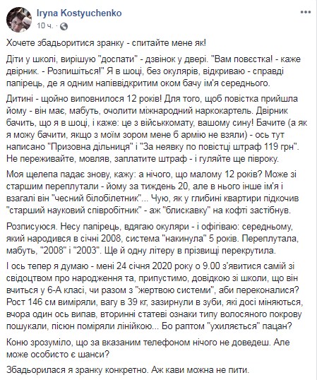 "Дзвінок у двері. "Вам повєстка! - каже двірник. - Розпишіться!" Я в шоці відкриваю, папірець, бачу ім'я середнього. Дитині 12 років! Двірник бачить, що я в шоці, каже: це з військкомату, вашому сину! ось написано "Призовна дільниця" і "За неявку по повістці штраф 119 грн". Не переживайте, мовляв, заплатите штраф - і гуляйте ще півроку", - розповіла жінка.
