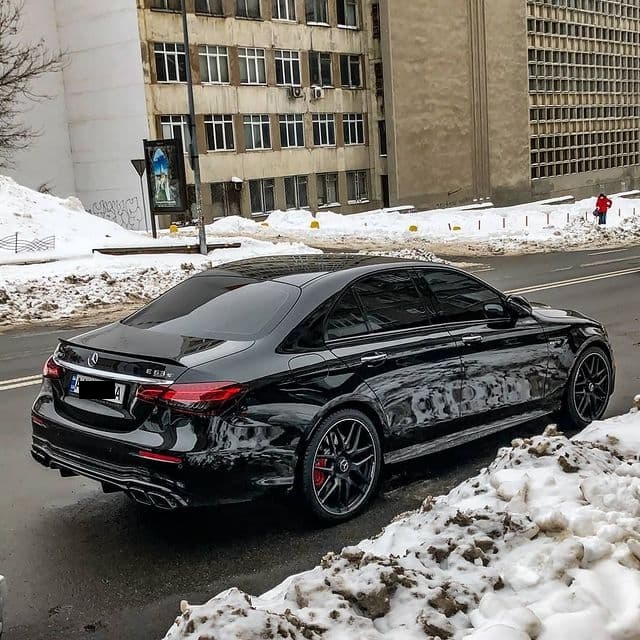 На знімку новенький автомобіль красувався відчищеним до блиску кузовом на тлі брудних снігових заметів Києва. Цей потужний швидкісний автомобіль все ще вважається новинкою. Модель Mercedes-AMG E 63 S 4MATIC має повний привід, набирає 100 км/год всього за 3,4 секунди і максимально розганяється до 250 км /год.