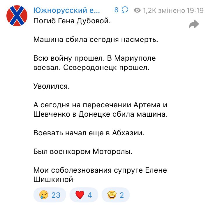"Загинув Дубовий у найкращих традиціях професійних новоросів. Його задавили машиною російські військові. Прямо у самому центрі, перед будівлею ОДА. На перехресті вул. Артема та бульвару Шевченка", - написав Казанський.