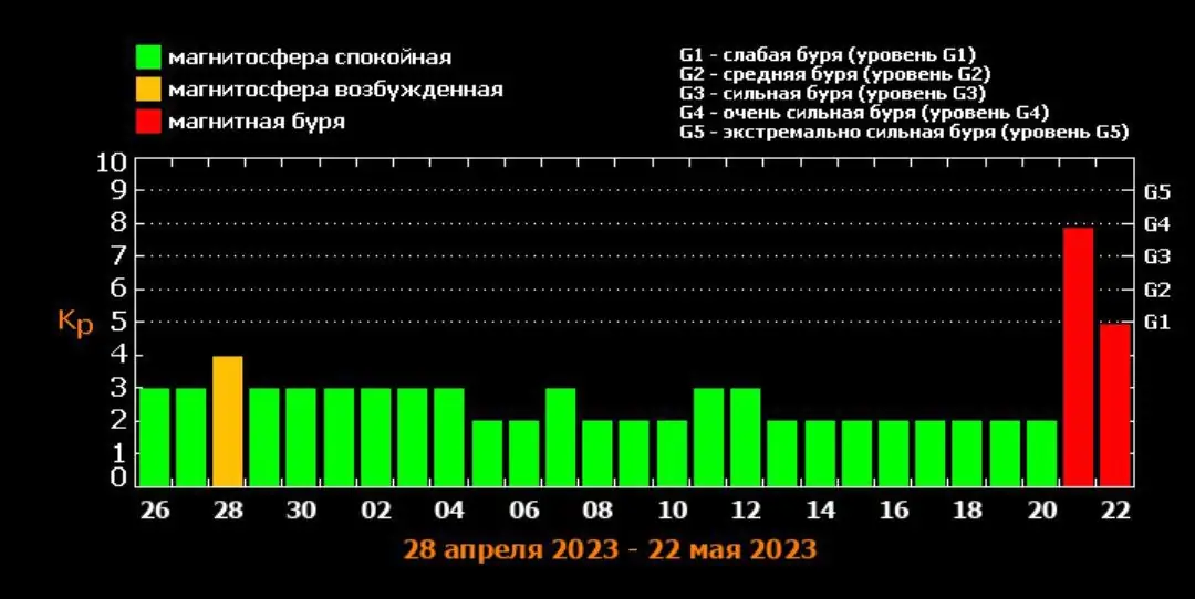 Наступна дата, коли прогнозується магнітна буря рівня G1 (слабка) - 27 квітня. Вона відбудеться внаслідок спалаху на Сонці 24 квітня.