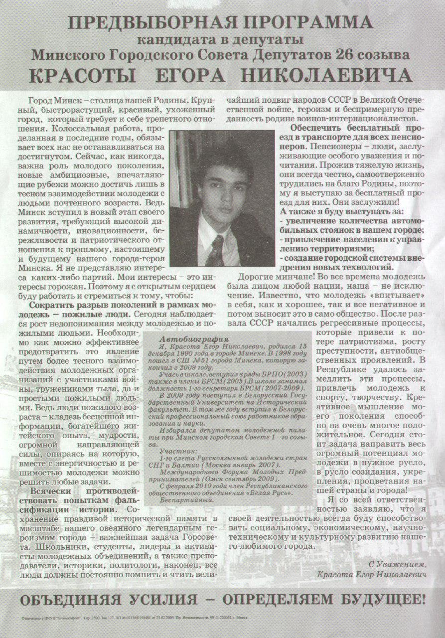 "За іронією долі, будучи вже при народженні "до мозку кісток" російською людиною, я народився і виріс в Білорусі, яка за іронією долі до мого свідомого віку була вже так званою незалежною державою", - писав Єгор Красота на одному з "русскомірскіх" сайтів.