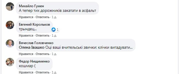 Користувачі Facebook розкритикували роботу дорожників в Миколаєві. Деякі коментатори припустили, що співробітники дорожніх служб перебували в стані алкогольного сп'яніння, коли клали асфальт, а інші назвали комунальників шкідниками.