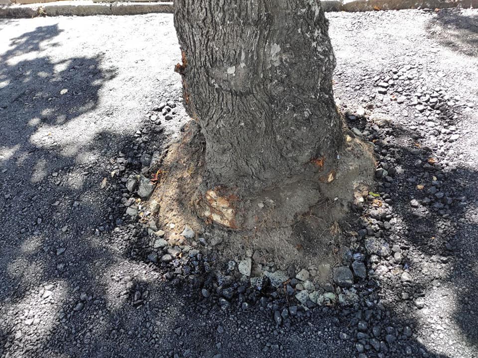 "Миколаїв, Нікольська і кут Артилерійської, навпроти військової комендатури. Дорожники дійсно повністю закатали дерева в асфальт. Після публікацій в ФБ, сьогодні асфальт трохи відгребли від дерев, але так робити не можна", - написав Левченко і опублікував фотографії з результатом роботи співробітників дорожніх служб .