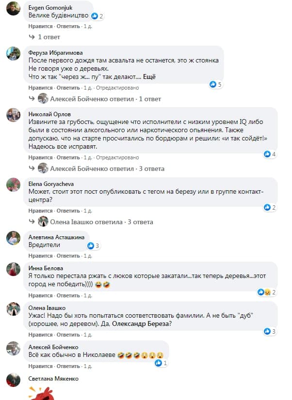 "Після першого дощу там асфальту не залишиться, це ж стоянка. Не кажучи вже про дерева. Що ж "через д*пу" так роблять", "Вибачте за грубість, відчуття що виконавці з низьким рівнем IQ або були в стані алкогольного або наркотичного сп'яніння", "Шкідники", "Все як завжди в Миколаєві", "Кошмар", - написали користувачі в коментарях.