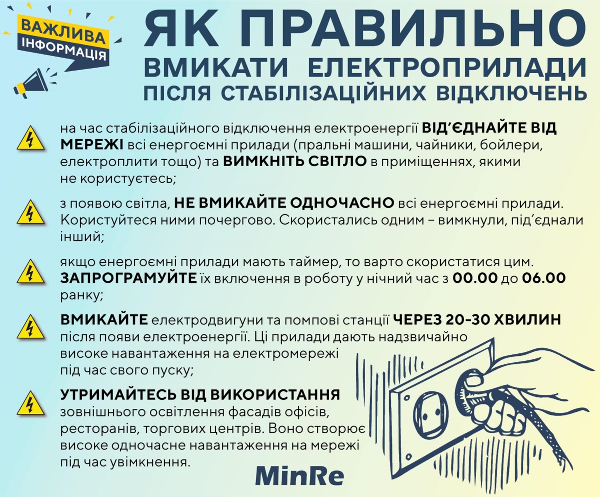 - Коли електропостачання відновлять, не вмикайте одночасно всі прилади. Користуйтеся ними почергово.