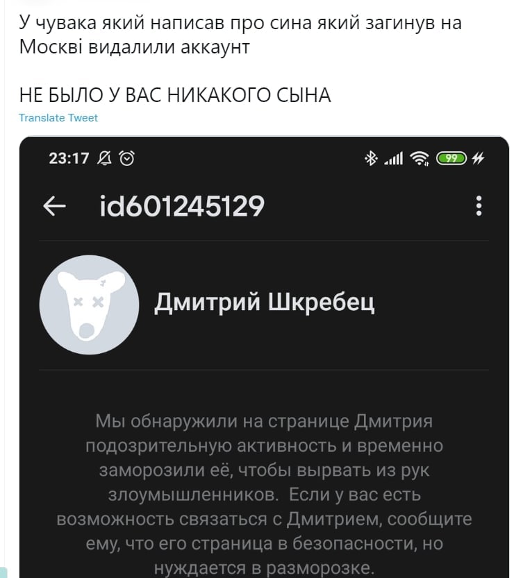 "Не встиг Дмитро Шкребець написати про пошук правди за зниклого сина-моряка Єгора Шкребеця, як знесли його фейсбук-сторінку. Хоча, на цій сторінці він вихвалявся тим, що Україну потрібно знищити. А вийшло так, що Україна знищила його нащадка, щоб рашисти не розмножувалися...", - пише Telegram-канал.