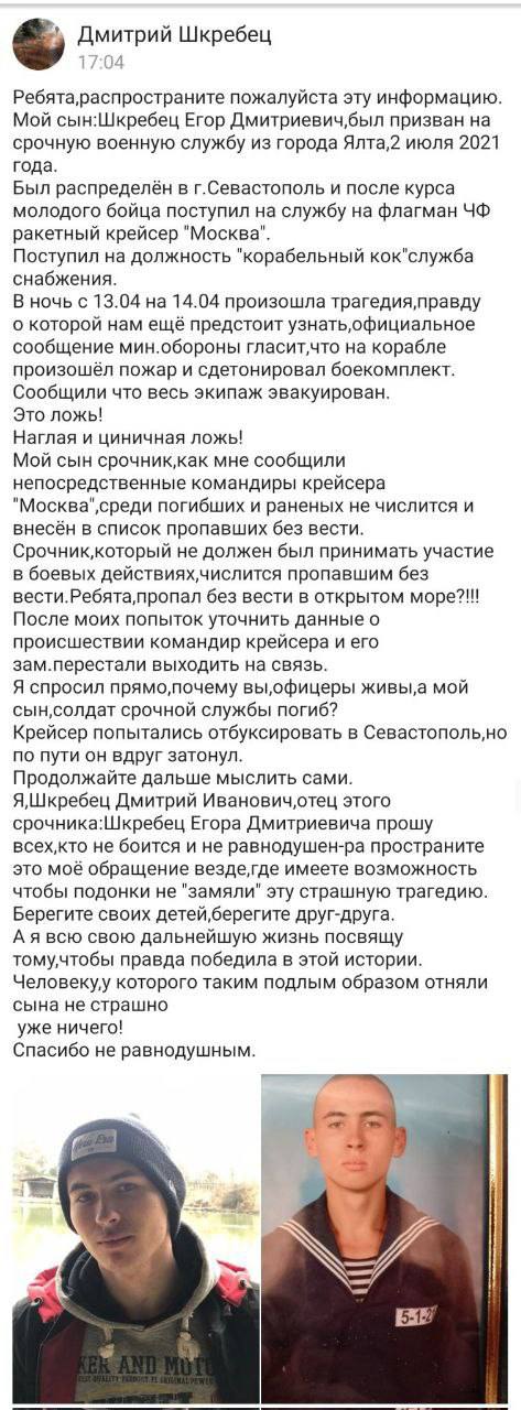 Йдеться про Дмитра Шкребеця, який втратив сина-моряка Єгора Шкребеця, котрий потрапив на службу на флагман ЧФ ракетний крейсер "Москва" на посаду "корабельний кок". Проте, коли крейсер пішов на дно - його син раптом опинився у списках "зниклих безвісти", а не в списках врятованих чи загиблих. А командир крейсера перестав виходити на зв'язок.