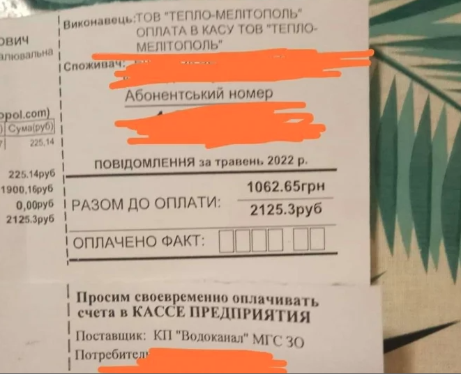 Так, РІА-Мелітополь повідомляє про те, що квитанції на комунальні послуги у місті стали приходити у рублях та гривнях. Це робиться з розрахунком на те, що якщо хтось стверджуватиме, що гривня закінчилася – їх змусять віднести до каси підприємств видані рублі.
