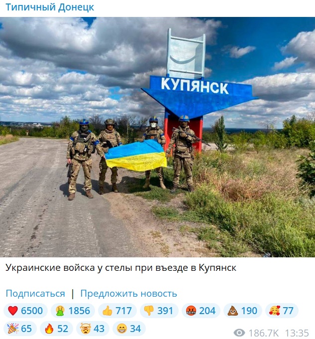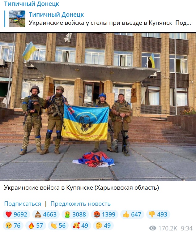 Люди у місцевих Telegram-каналах Донецька із захопленням реагують на фотографії Збройних Сил України у Куп'янську Харківської області, яке за неофіційною інформацією звільнили українські воїни.