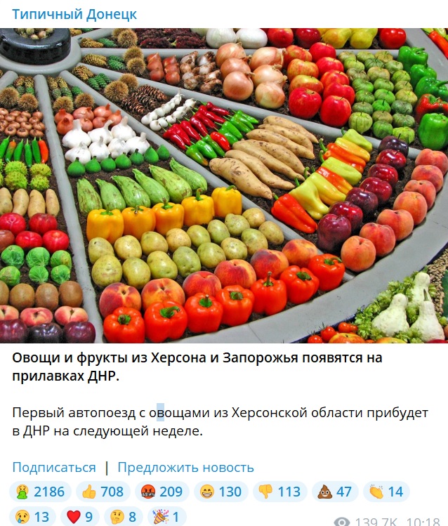 У свою чергу, на новину про появу на прилавках так званої "ДНР" овочів та фруктів з окупованого Херсонської області та Запоріжжя користувачі відреагували безліччю емодзі, яких нудить - 2 186.