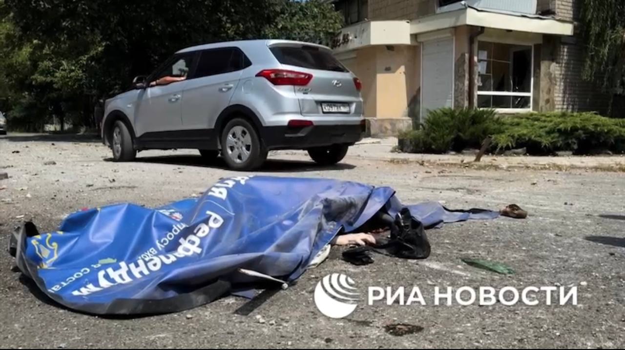 Російські окупанти показали по ТБ кадри загиблої громадянки від падіння збитої ракети у Донецьку, накритої політичним плакатом, який лишився з часів псевдореферендуму на окупованих територіях України у 2022 році.