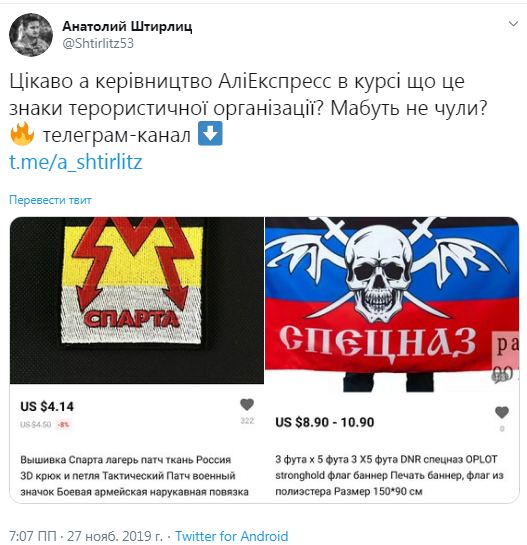 "Цікаво а керівництво АліЕкспресс в курсі що це знаки терористичної організації? Мабуть не чули", - пише він.