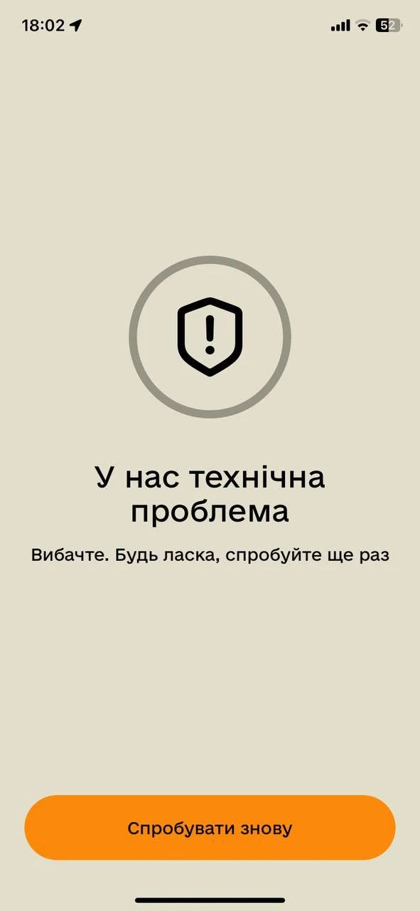 "У нас технічна проблема. Вибачте. Будь ласка, спробуйте ще раз", - написано на головному екрані застосунку.